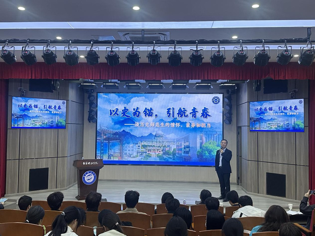 11月11日下午,旅社院联合学校校友会办公室在行知100报告厅举办“以史为锚,引航青春——谈历史师范生的情怀、素养和担当”专题讲座,主讲人为南京晓庄学院历史系1994级杰出校友、中学正高级教师、南京市雨花台中学校长孙进。学校发规处(校友会办公室)副处长(副主任)黄丹、学院党委书记张洁、历史学专业负责人秦翠红、教师代表和80余名历史学(师范)与历史学专业新生共同聆听,讲座由旅社院院长李昌庚主持。