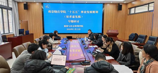 2026年1月13日下午,旅社院党委召开理论学习中心组专题学习会,专题学习党的二十届四中全会精神以及《中共中央关于制定国民经济和社会发展第十五个五年规划的建议》和习近平总书记《关于<中共中央关于制定国民经济和社会发展第十五个五年规划的建议>的说明》,专题研讨《南京晓庄学院“十五五”事业发展规划(征求意见稿)》。会议由学院党委书记张洁主持,学院党委理论学习中心组全体成员参加学习,部分骨干教师列席。