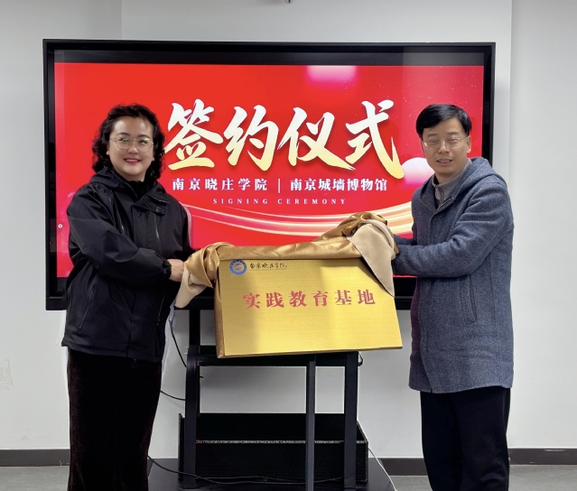 仪式现场,双方代表郑重签署合作协议,随后共同为“南京晓庄学院实践教育基地”揭牌,标志着双方校馆共建、协同育人合作正式落地。作为展示明城墙历史文化遗产的核心窗口,南京城墙博物馆不仅是南京历史文化名城的亮丽名片,更是开展爱国主义教育、传承中华优秀传统文化的重要阵地,其丰富的文化资源与我校的教育教学优势高度契合。