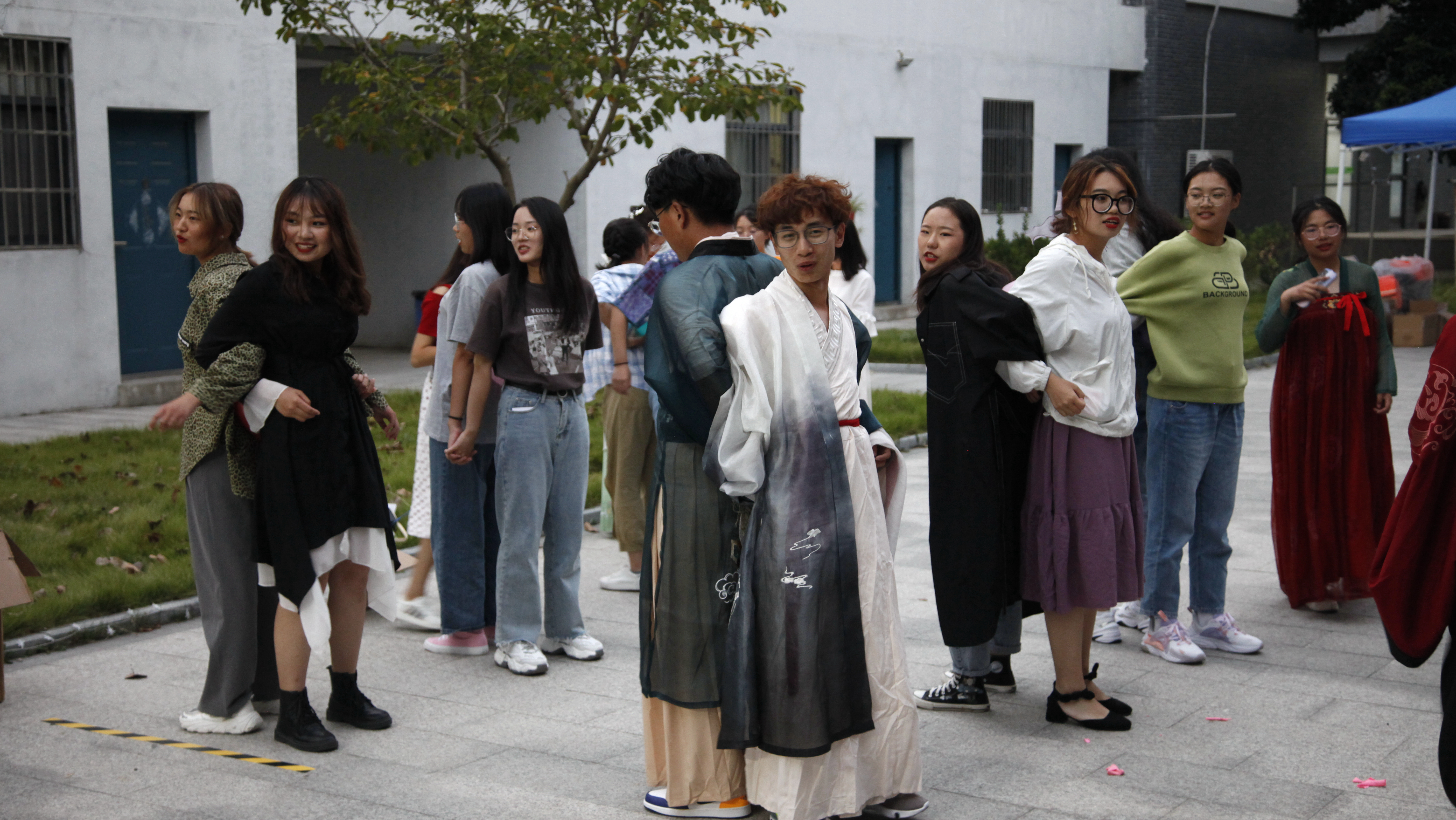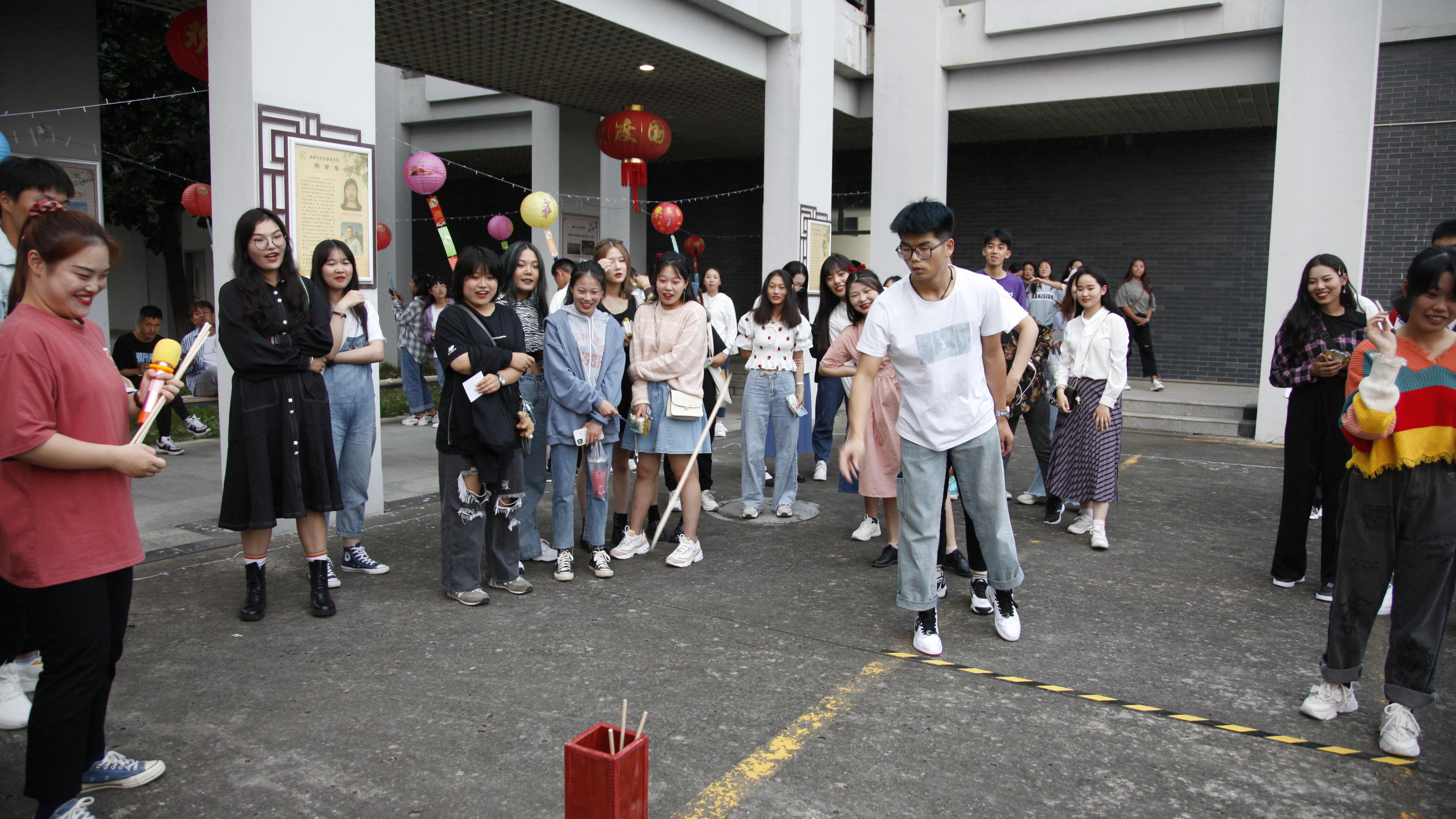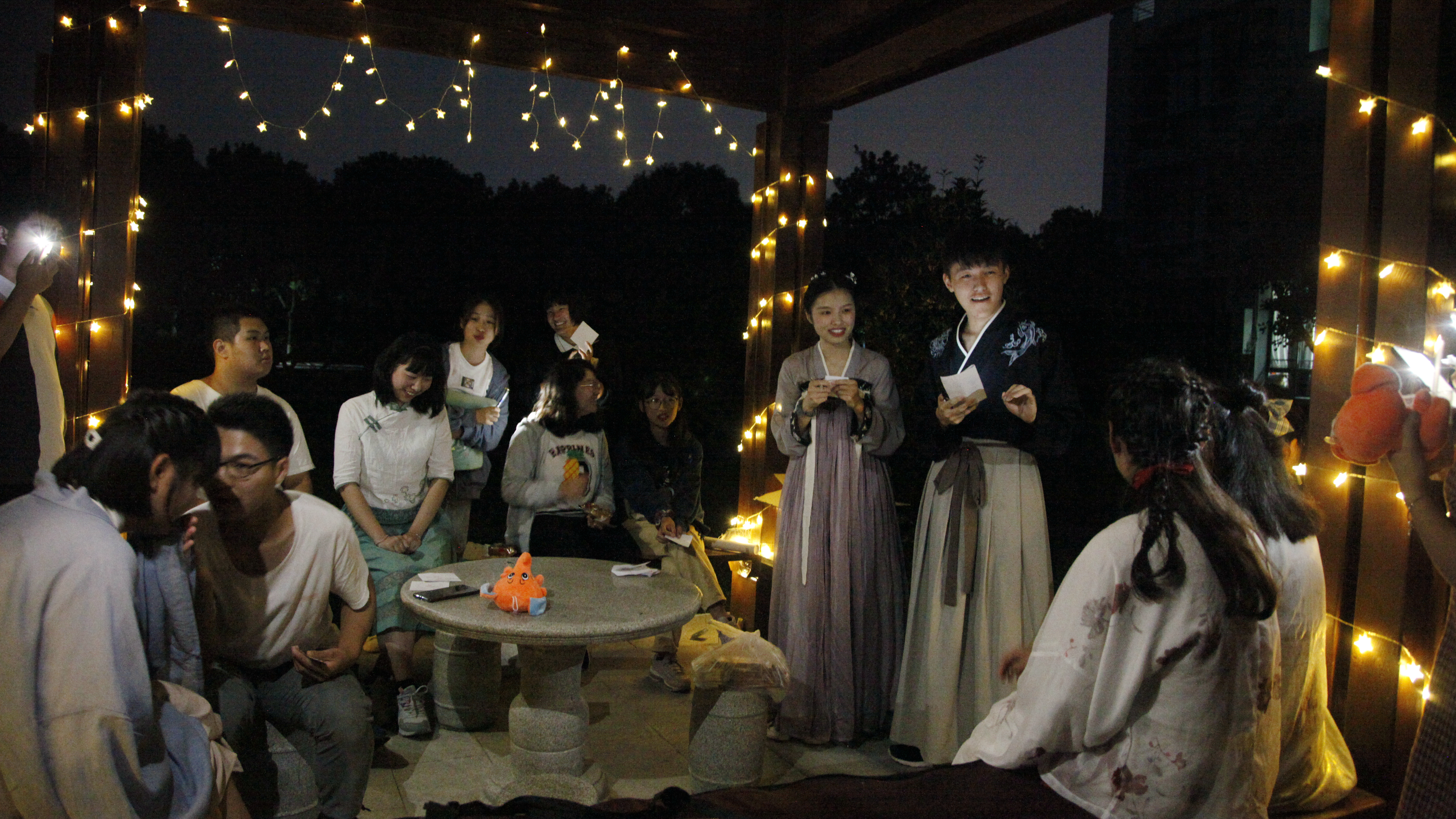 2020年9月30日晚,在文浚苑、陶子亭,同学们进行了赏月对诗、猜灯谜、’汉服秀、投壶竞赛、观看革命电影。联谊晚会活动上,到场的同学每人抽取了一张字条,进行配对做游戏,公主抱,背人行走,期间阵阵欢声笑语,迅速拉近大家心与心的距离。陶子亭诗会,或书声朗朗,或欣赏墨宝;汉服秀、古筝表演让气氛达到高潮。月光下,同学们一起猜灯谜、玩游戏,观看革命电影。
