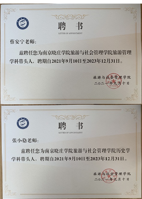 为助推学校“一流学科”“一流专业”建设和内涵发展,旅游与社会管理学院高度重视学科带头人及团队建设工作,并为学科发展提供良好的学科生态和政策保障,学院聘任蔡安宁教授为南京晓庄学院旅游与社会管理学院旅游管理学科带头人,聘任张小稳教授为南京晓庄学院旅游与社会管理学院历史学学科带头人。