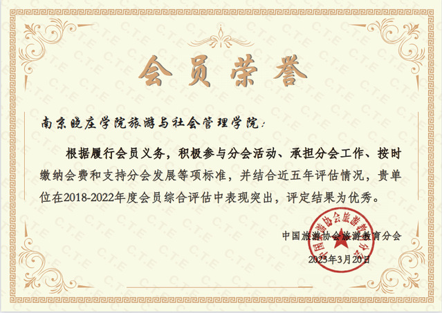 南京晓庄学院旅游与社会管理学院是中国旅游协会旅游教育分会会员,在2018-2022年度会员综合评估中表现突出,评定结果为优秀。2023年4月7日中国旅游协会旅游教育分会给我院发来荣誉证书。
