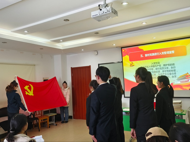 在预备党员转正大会上,由陈雨婷等5名预备党员汇报自己预备期间的思想、学习、实践工作情况,表达自己转正的强烈意愿,随后进行入党介绍人的评议环节以及无记名投票表决。陈子恒等5名预备党员经大会全票通过转正成为正式党员后,面向党旗进行了入党誓词宣誓,表明全心全意为人民群众服务的决心和为共产主义事业奋斗终身的信念。